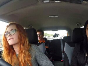 Τρίο FFM γαμήσι σε ψεύτικο αυτοκίνητο οδήγησης κολεγίου